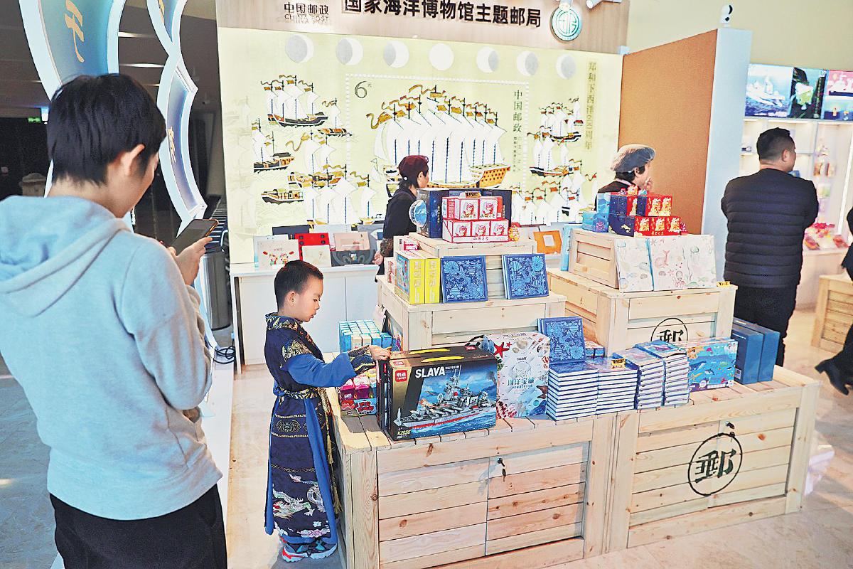 國(guó)家海洋博物館主題郵局是國(guó)內(nèi)首個(gè)海洋主題郵局,也是第一個(gè)啟用主題郵局日戳的郵局。對(duì)于喜歡在旅行中留下回憶的集郵愛(ài)好者劉先生來(lái)說(shuō),這里是他來(lái)國(guó)家海洋博物館的必打卡地。劉先生在主題郵局內(nèi)集齊了所有紀(jì)念戳,足足蓋了幾頁(yè)紙,購(gòu)買的主題文創(chuàng)產(chǎn)品也塞滿了書包,可嘴里還是念叨著:“沒(méi)逛夠,有機(jī)會(huì)還要再來(lái)?!?/p>